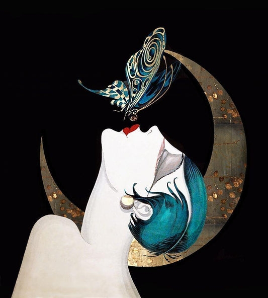Butterfly Kiss Art Deco Woman Black Ornate Wood Framed Art Print with Double Matting by Lavoie, Tina