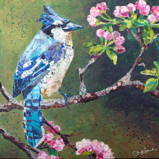 Blue Jay on Apple Blossoms White Modern Wood Framed Art Print with Double Matting by St Hilaire, Elizabeth