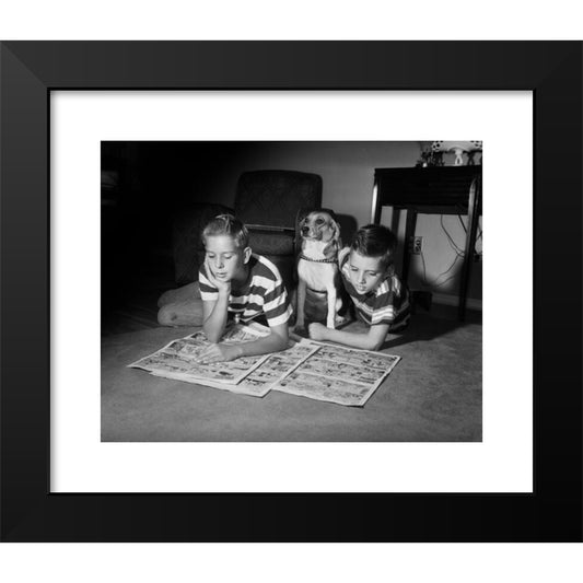 1960's Image Collection by ClassicStock - Black Modern Wood Framed Art Print Titled: 1950s TWO BOYS READING SUNDAY COMICS LIVING ROOM FLOOR DOG INDOOR FUNNY PAPERS NEWSPAPERS