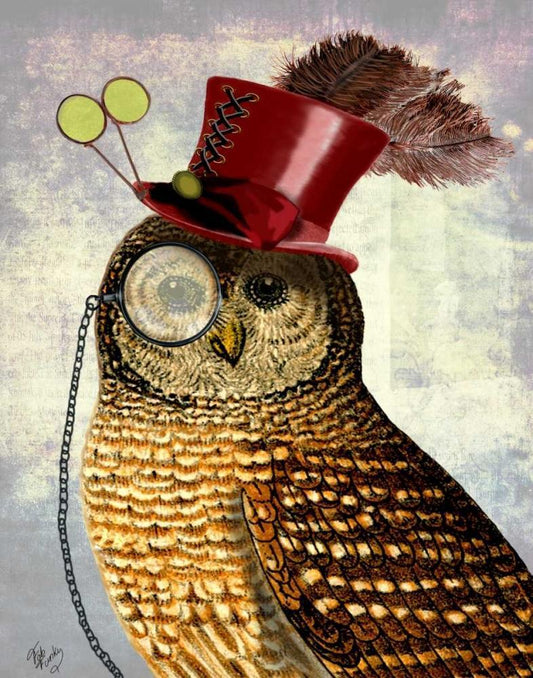 Owl With Top Hat White Modern Wood Framed Art Print with Double Matting by Fab Funky