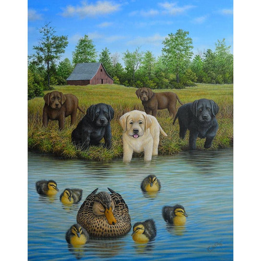 Puppies And Ducklings White Modern Wood Framed Art Print by Wavra, Robert
