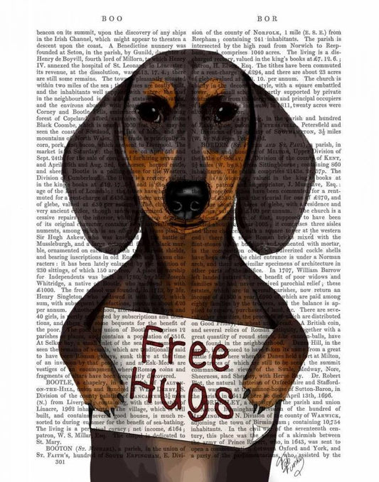 Dachshund Free Hugs White Modern Wood Framed Art Print with Double Matting by Fab Funky
