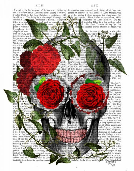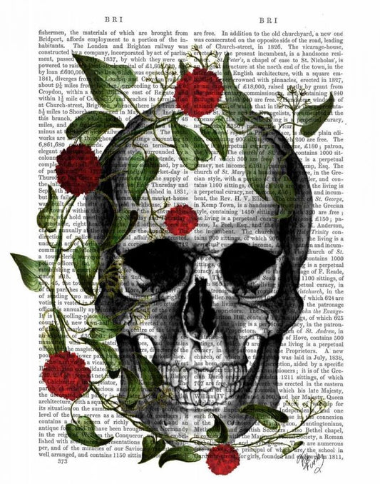 Skull With Roses And Vines White Modern Wood Framed Art Print with Double Matting by Fab Funky