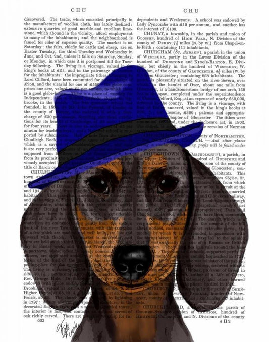 Dachshund With Blue Trilby White Modern Wood Framed Art Print with Double Matting by Fab Funky