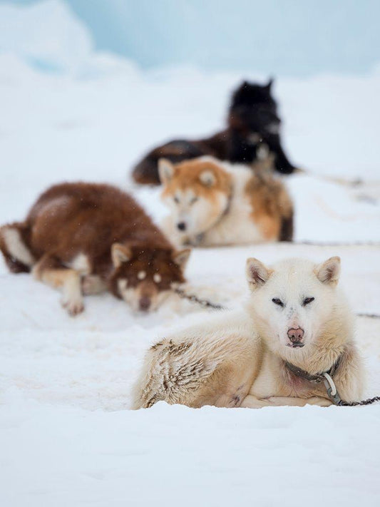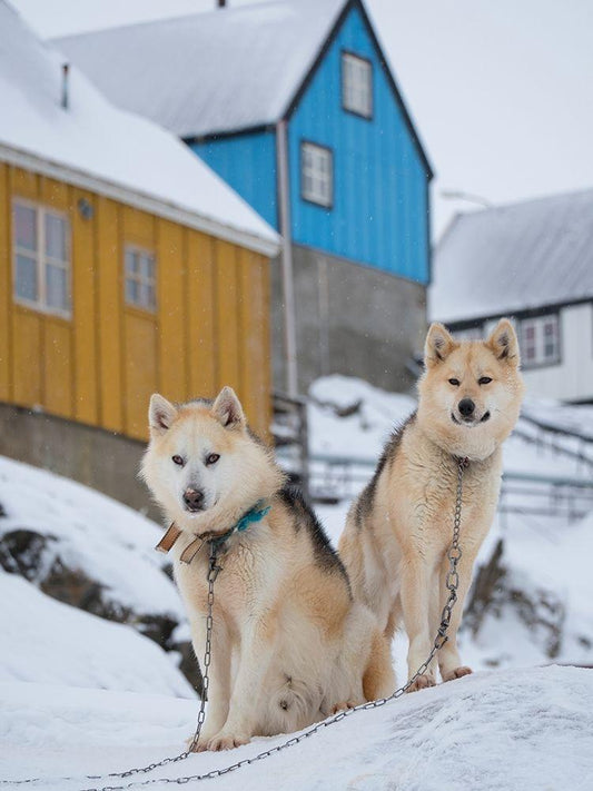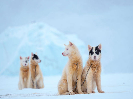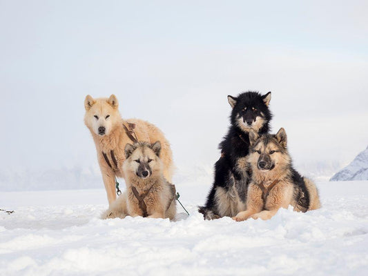 Team of sled dog during winter in Uummannaq in Greenland White Modern Wood Framed Art Print with Double Matting by Zwick, Martin