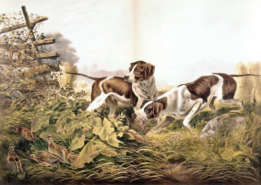 American Field Sports. On a Point. White Modern Wood Framed Art Print with Double Matting by Currier and Ives