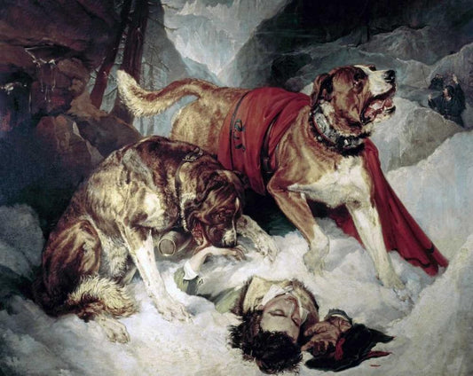 Alpine Mastiffs Reanimating a Distressed Traveller White Modern Wood Framed Art Print with Double Matting by Landseer, Sir Edwin