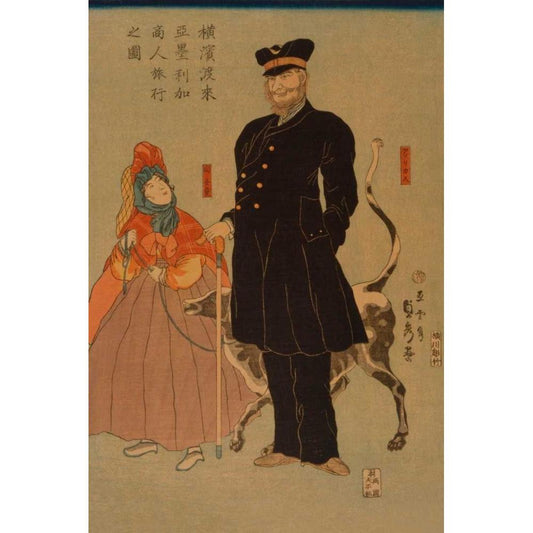 French girl taking walk with dog (Furansu komusume inu o hikite sampo no zu), 1860 White Modern Wood Framed Art Print by Utagawa, Sadahide