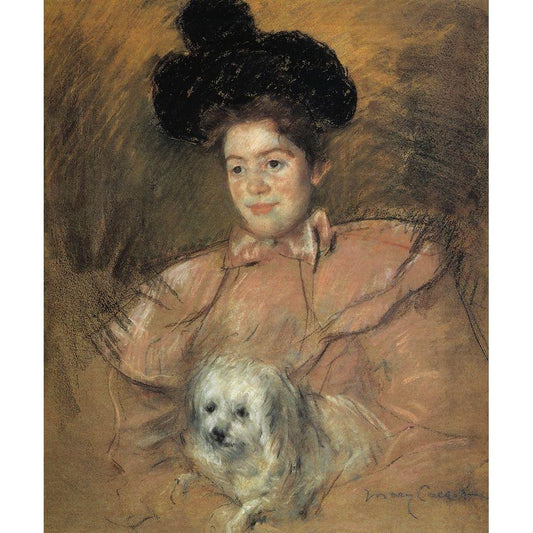 Woman In Raspberry Costume Holding A Dog 1901 White Modern Wood Framed Art Print by Cassatt, Mary