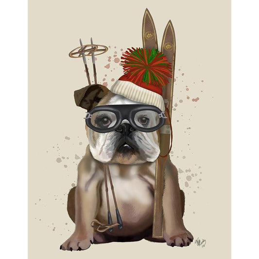 English Bulldog, Skiing White Modern Wood Framed Art Print by Fab Funky