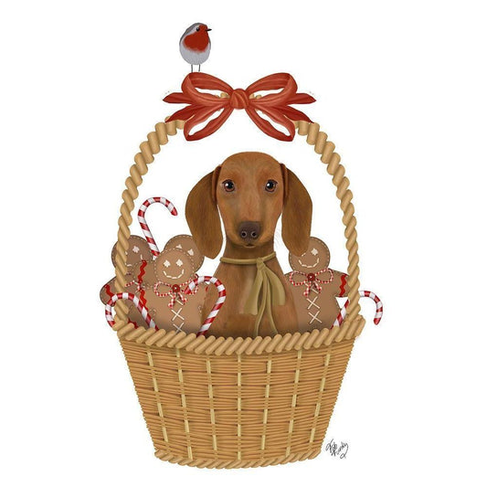 Christmas Des - Dog in Basket with Gingerbread Men White Modern Wood Framed Art Print by Fab Funky