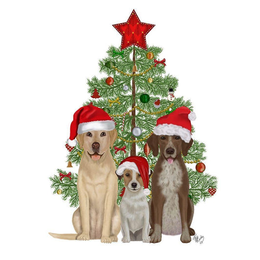 Christmas Des - Dog Trio Christmas Tree White Modern Wood Framed Art Print by Fab Funky