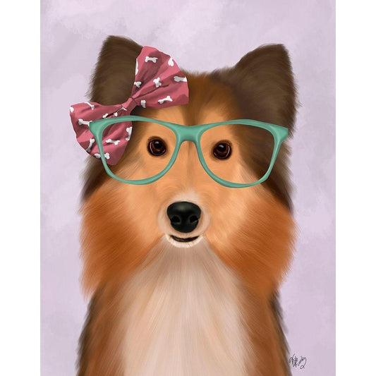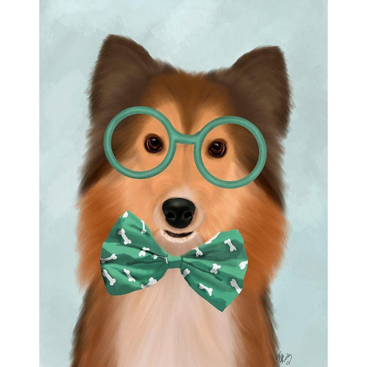 Shetland Sheepdog with Glasses and Bow Tie White Modern Wood Framed Art Print by Fab Funky
