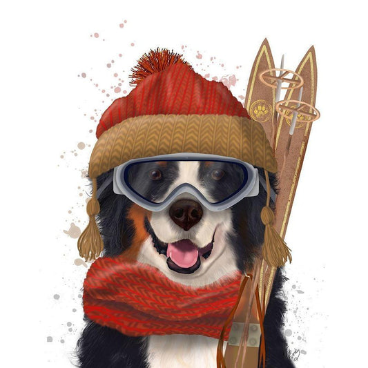 Bernese Ski Dog White Modern Wood Framed Art Print by Fab Funky