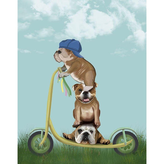 English Bulldog Scooter White Modern Wood Framed Art Print by Fab Funky
