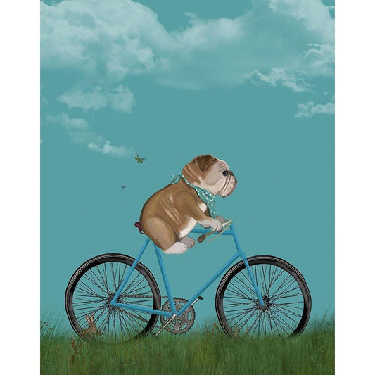 English Bulldog on Bicycle - Sky White Modern Wood Framed Art Print by Fab Funky
