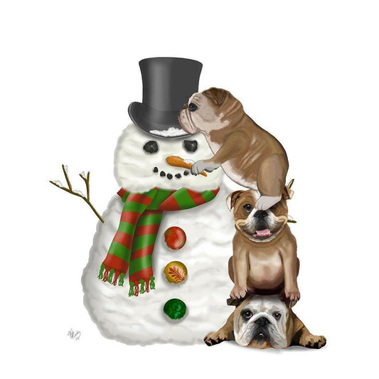 Christmas English Bulldogs Building Snowman White Modern Wood Framed Art Print by Fab Funky
