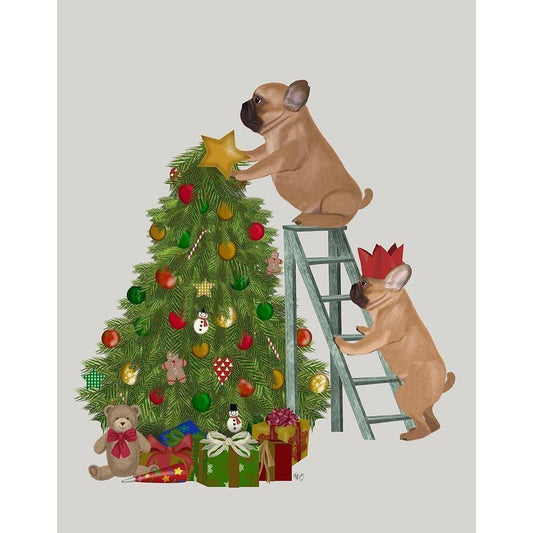 Christmas French Bulldog Tree Ladder White Modern Wood Framed Art Print by Fab Funky