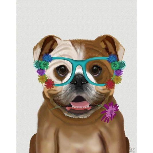 English Bulldog and Flower Glasses White Modern Wood Framed Art Print by Fab Funky