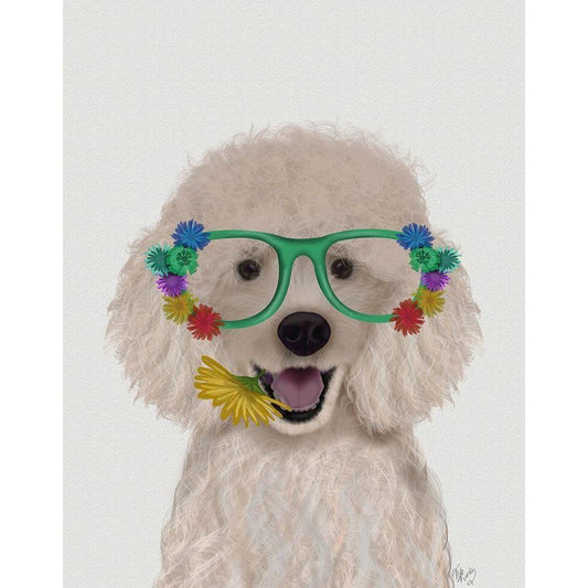Poodle, White and Flower Glasses White Modern Wood Framed Art Print by Fab Funky