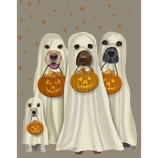 Halloween Trick or Treat Dogs White Modern Wood Framed Art Print by Fab Funky