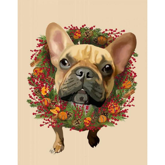 French Bulldog, Cranberry Wreath White Modern Wood Framed Art Print by Fab Funky