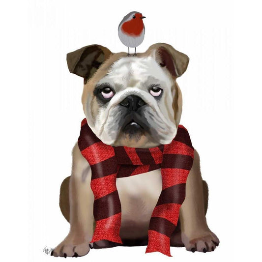 English Bulldog, Scarf and Robin White Modern Wood Framed Art Print by Fab Funky