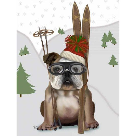 English Bulldog, Skiing White Modern Wood Framed Art Print by Fab Funky