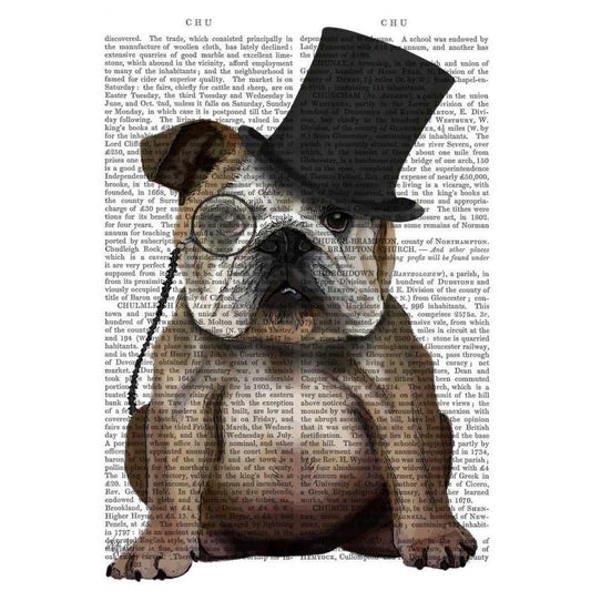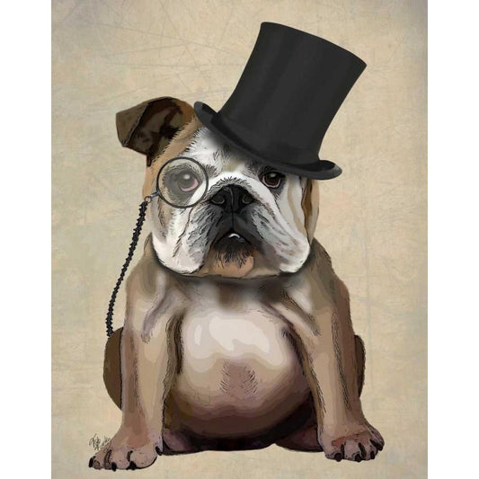 English Bulldog, Formal Hound and Hat White Modern Wood Framed Art Print by Fab Funky