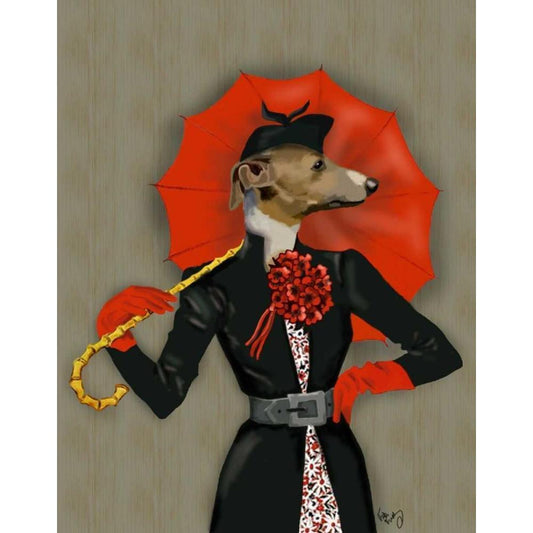 Elegant Greyhound and Red Umbrella White Modern Wood Framed Art Print by Fab Funky