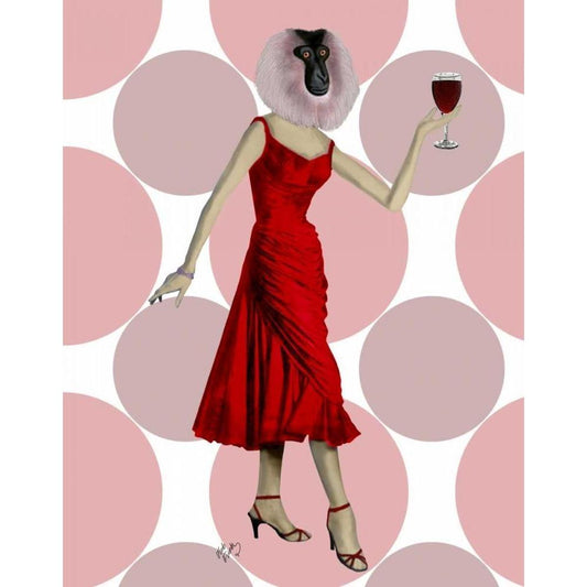 Monkey in Red Dress with wine White Modern Wood Framed Art Print by Fab Funky