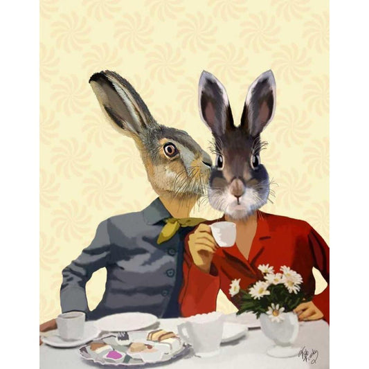 Lady Bella Rabbit Taking Tea White Modern Wood Framed Art Print by Fab Funky