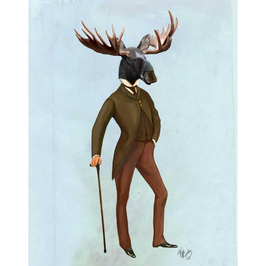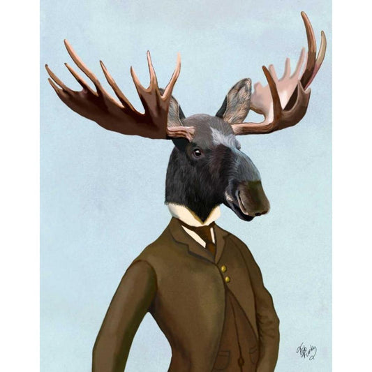 Moose In Suit Full White Modern Wood Framed Art Print by Fab Funky