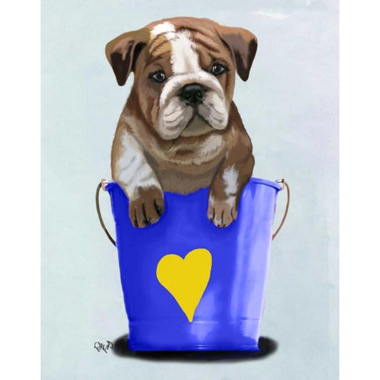 Bulldog Bucket Of Love Blue White Modern Wood Framed Art Print by Fab Funky