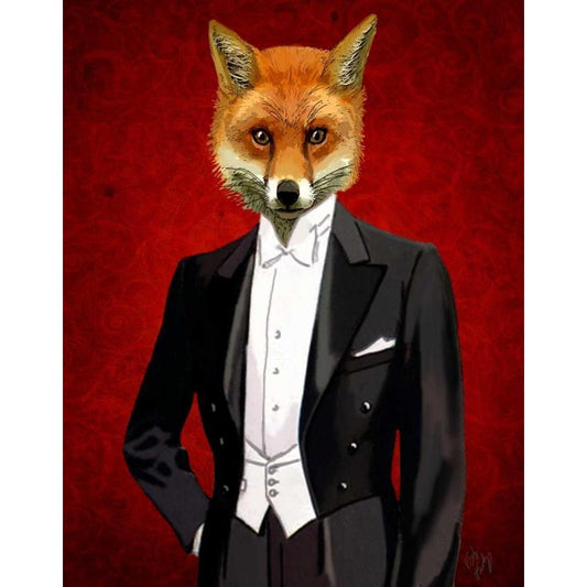 Fox In Evening Suit Portrait White Modern Wood Framed Art Print by Fab Funky