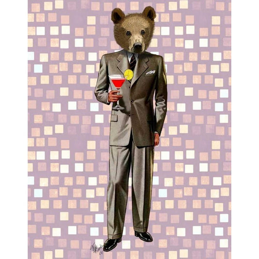 Bear With Cocktail White Modern Wood Framed Art Print by Fab Funky