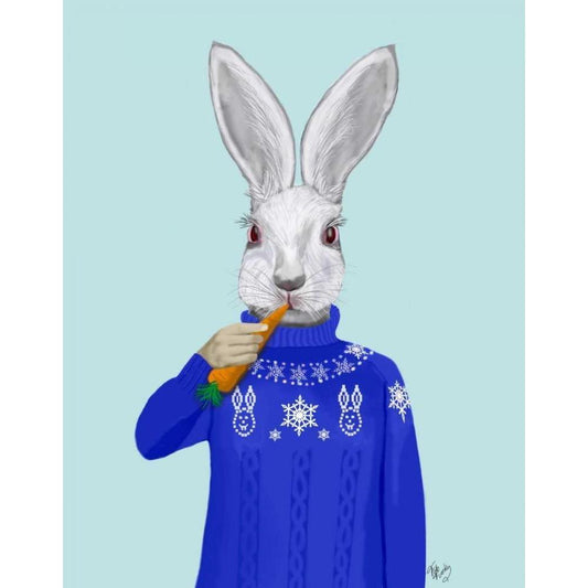 Rabbit In Sweater White Modern Wood Framed Art Print by Fab Funky