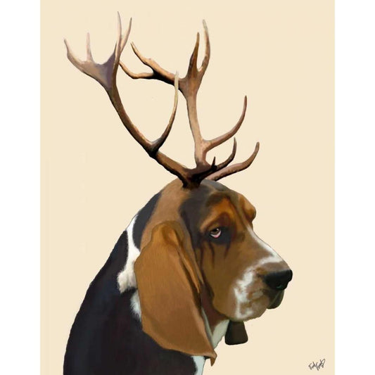 Basset Hound and Antlers White Modern Wood Framed Art Print by Fab Funky