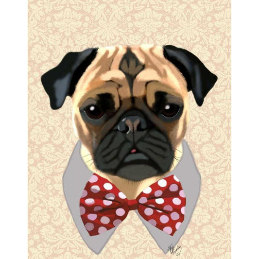 Pug with Red and White Spotty Bow Tie White Modern Wood Framed Art Print by Fab Funky