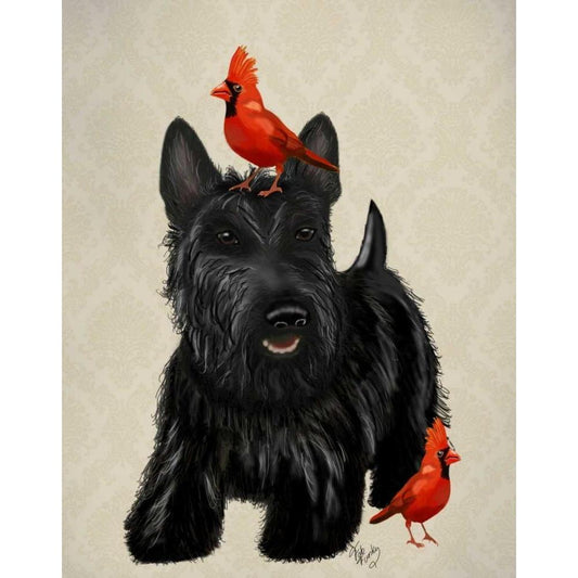 Scottie Dog and Red Birds White Modern Wood Framed Art Print by Fab Funky