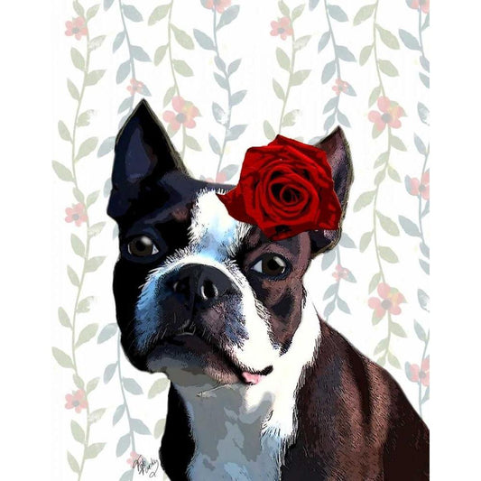 Boston Terrier with Rose on Head White Modern Wood Framed Art Print by Fab Funky