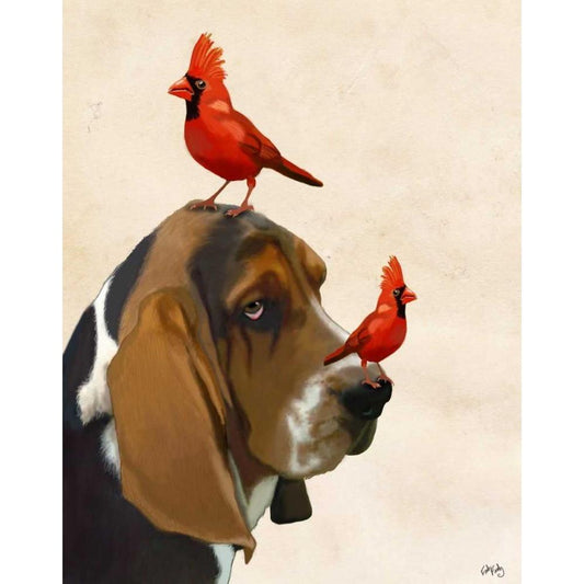 Basset Hound and Birds White Modern Wood Framed Art Print by Fab Funky