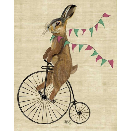 Rabbit On Penny Farthing White Modern Wood Framed Art Print by Fab Funky