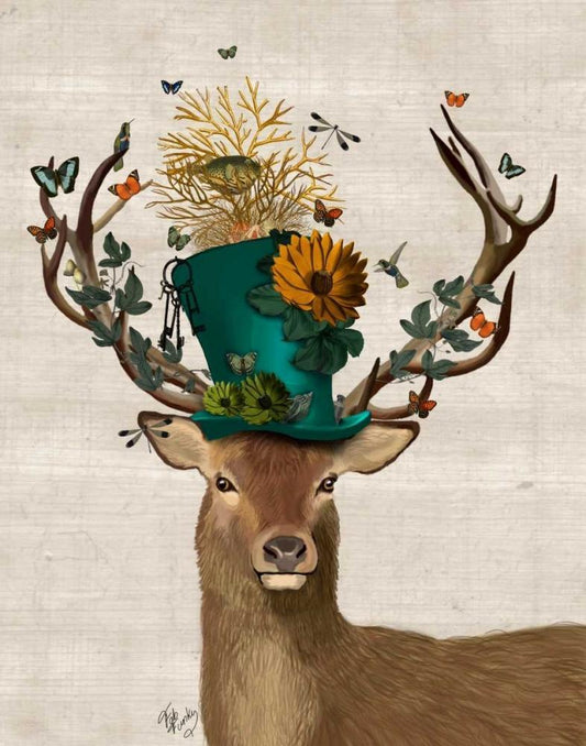 Mad Hatter Deer White Modern Wood Framed Art Print with Double Matting by Fab Funky