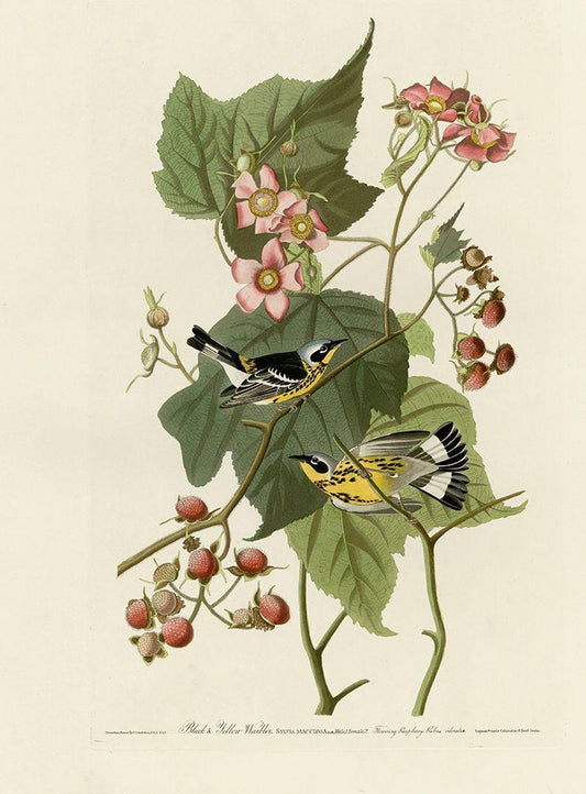 Black And Yellow Warblers Black Ornate Wood Framed Art Print with Double Matting by Vintage Apple Collection