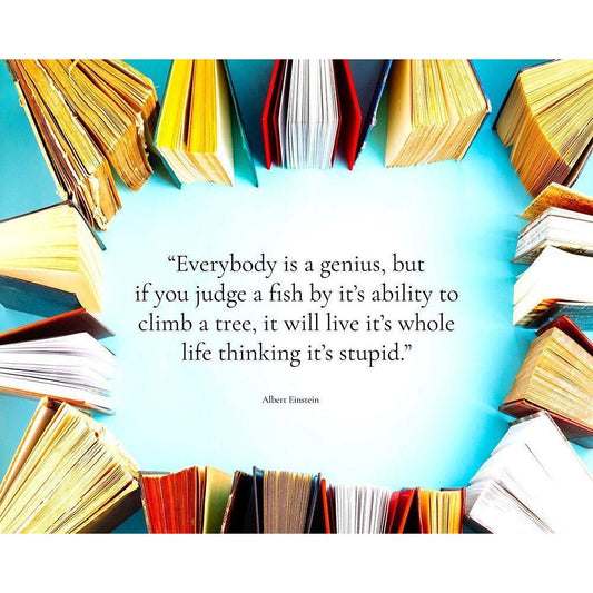 Albert Einstein Quote: Everybody is a Genius White Modern Wood Framed Art Print by ArtsyQuotes