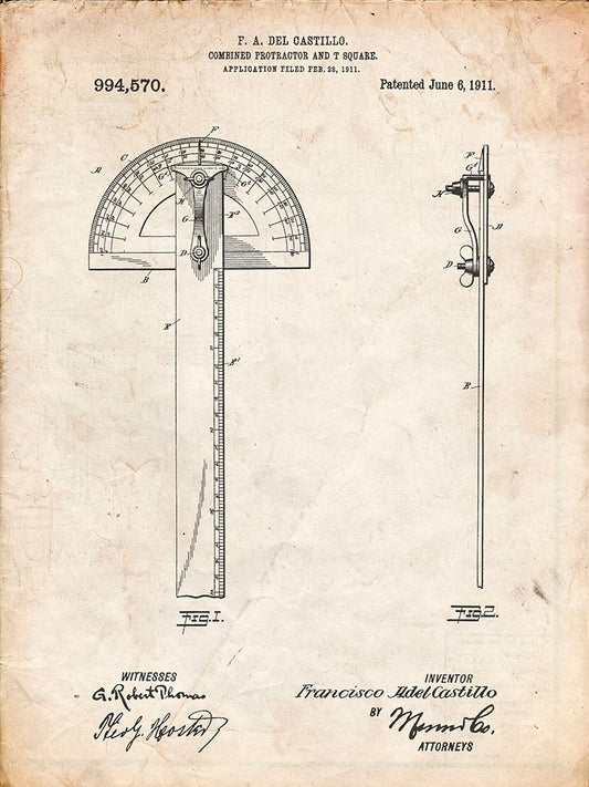 PP1002-Vintage Parchment Protractor T-Square Patent Poster White Modern Wood Framed Art Print with Double Matting by Borders, Cole