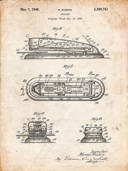 PP1052-Faded Blueprint Stapler Patent Poster White Modern Wood Framed Art Print with Double Matting by Borders, Cole