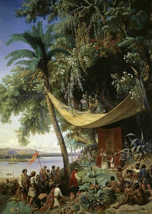 First Mass in America Black Ornate Wood Framed Art Print with Double Matting by Blanchard, Henri Pierre Leon