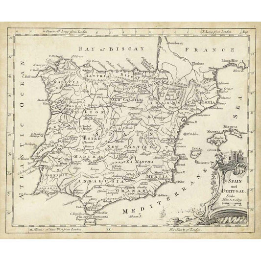 Map of Spain Black Modern Wood Framed Art Print with Double Matting by Jeffreys, T.